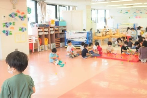 写真は3~5歳児の教室です。壁を使い、クラスごとに活動するときもあります。